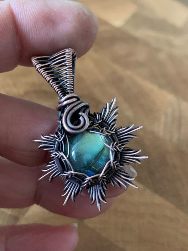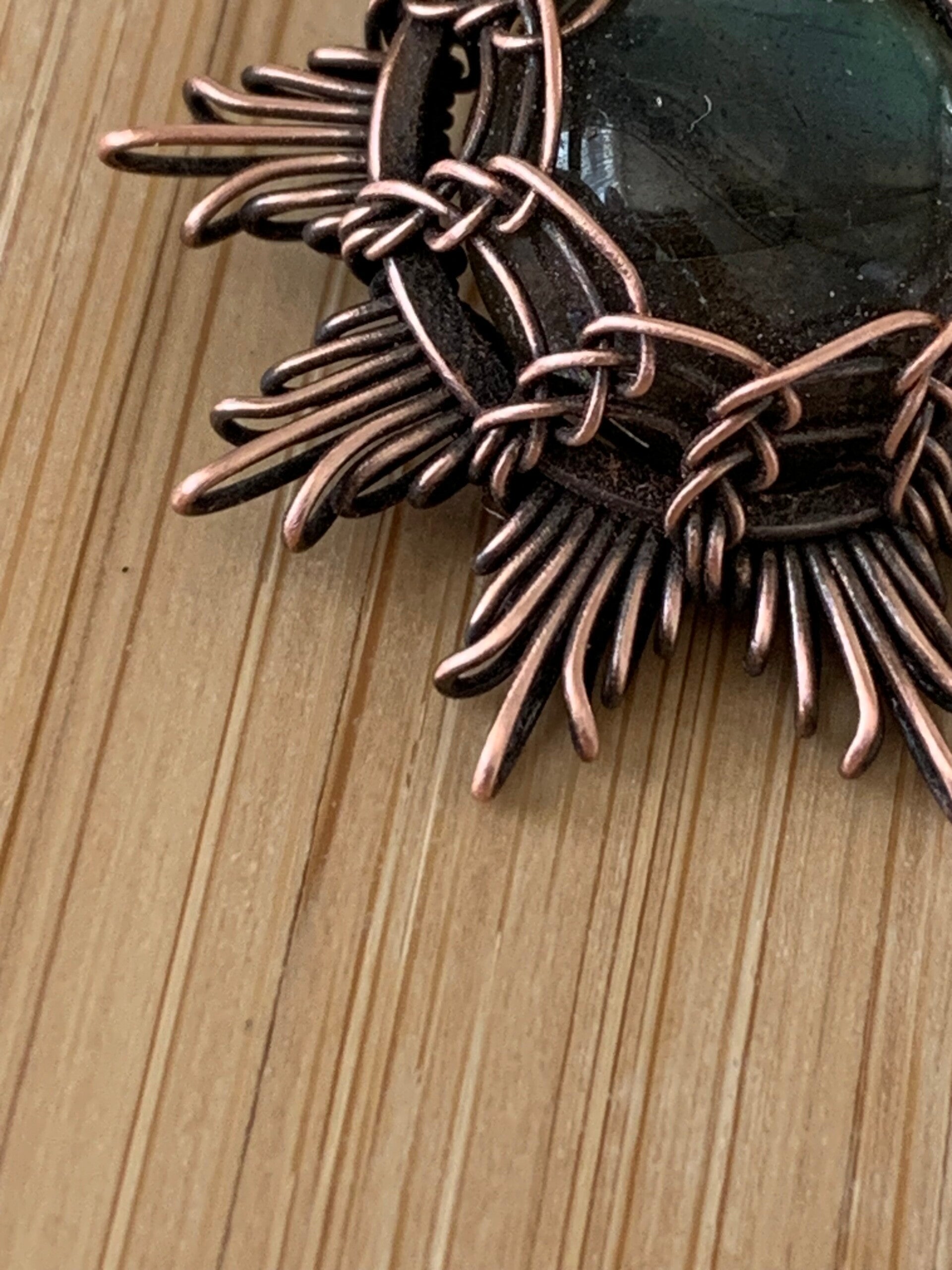 Wire wrapped star pendant featuring a beautiful green flash labradorite cabochon.